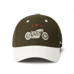 Olive & White Baseball Cap with Vintage Motorcycle Embroidery | Stylish Unisex Snapback Hat for Bikers & Casual Wear